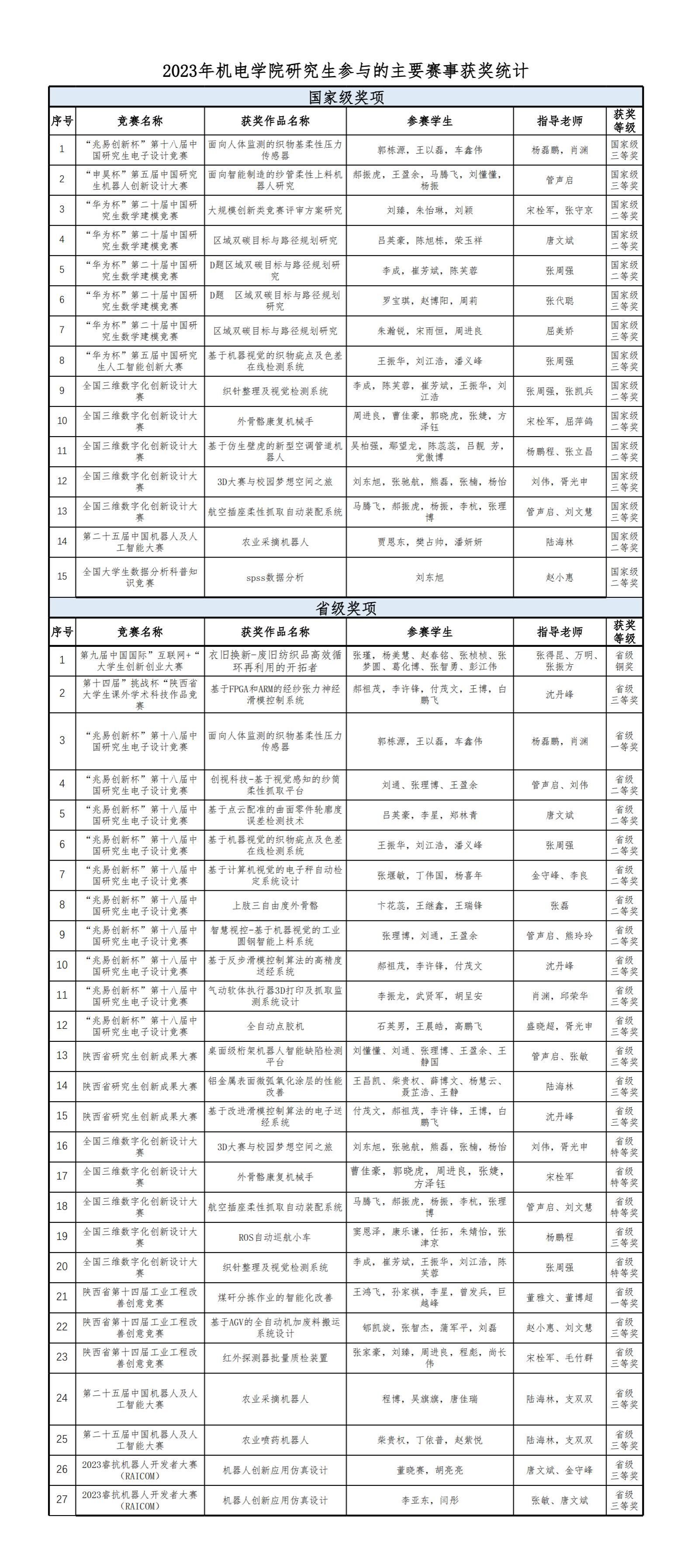2023年机电公司研究生参与的主要赛事获奖统计