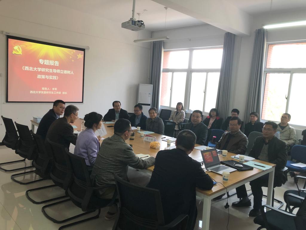 李军作了题为《建设高水平导师队伍,全面落实立德树人根本职责》的报告,他首先解读了《意见》出台的背景和主要内容,详细介绍了西北大学在研究生思想政治教育、导师队伍建设和研究生教育过程管理中的政策与实践经验,同时就如何做一名合格的研究生导师分享了个人的感悟和体会。他指出,研究生导师要珍惜导师荣誉、坚守职业情操、捍卫学术尊严,切实肩负起专业指导和德行教育的双重职责。报告结束后,与会教师就研究生奖助体系建设、思想政治教育、导师立德树人指标考核、过程培养质量与安全稳定、导师遴选培训、人才招聘等问题与李军进行了探讨交流。