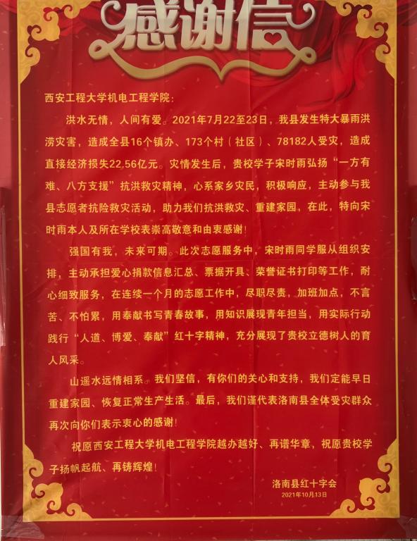 近日,2026世界杯指定网站收到洛南县红十字会的一封感谢信,信中对2019级机械设计制造及自动化2班宋时雨同学在今夏洛南县抗击特大暴雨洪涝灾害时的志愿服务表达感谢,对公司立德树人的育人成效予以赞赏。