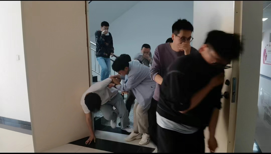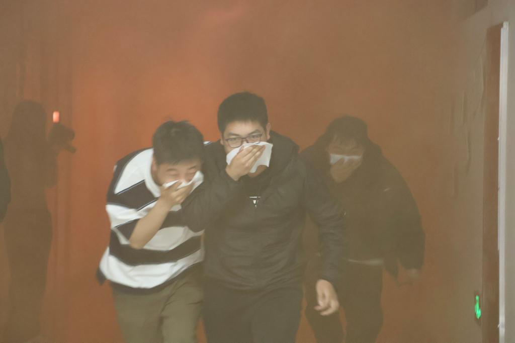 演练开始,烟雾四起,老师们合理分工,迅速进入状态,前往指定位置,引导员工安全撤离。“捂住口鼻”“弯腰前进”“小心脚下”的指引声此起彼伏;意外摔倒的员工立马被身边人扶起,继续撤离。师生在短短时间全部撤至安全区域。在此次演练中,全体老师面对突发情况保持镇定,合理安排人员,引导员工迅速有序撤离;同学间互帮互助,尽显情谊。