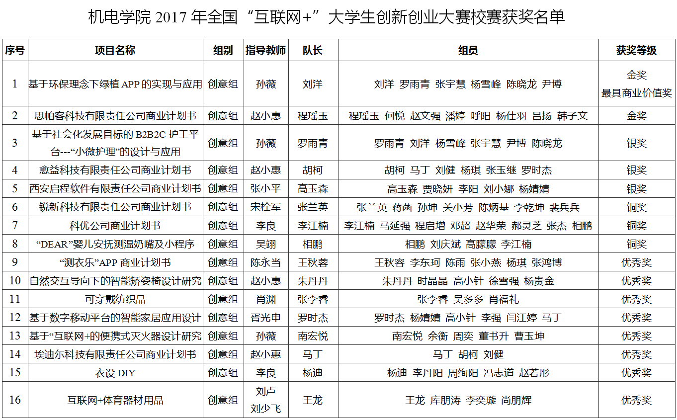 复赛采用答辩方式进行,参与团队结合自身学科背景,联系“互联网+”思维,从市场现状与分析、营销策略、团队运营与管理等方面对项目内容进行简要阐述。评委根据团队创业计划书及现场陈述进行点评,为每个项目指出不足之处,并从实际出发向选手们分析了有关预算、资金和团队发展思路等问题,对项目的创新性、商业性、团队建设、就业前景等方面进行综合评审打分。根据《2026世界杯指定网站“互联网+”老员工创新创业大赛奖励办法》(西工程大教字〔2016〕17号)等文件的精神,评审专家委员会对参赛项目进行了评审,机电公司获得金奖2个、银奖3个、铜奖3个、优秀奖8个、优秀创新创业导师奖1个、最具商业价值奖1个。其中,工业设计教研室孙薇老师所指导的创业项目《基于环保理念下绿植APP的实现与应用》代表公司赴西安电子科技大学参加了省级答辩,最终荣获第三届中国“互联网+”老员工创新创业大赛陕西赛区省级铜奖。