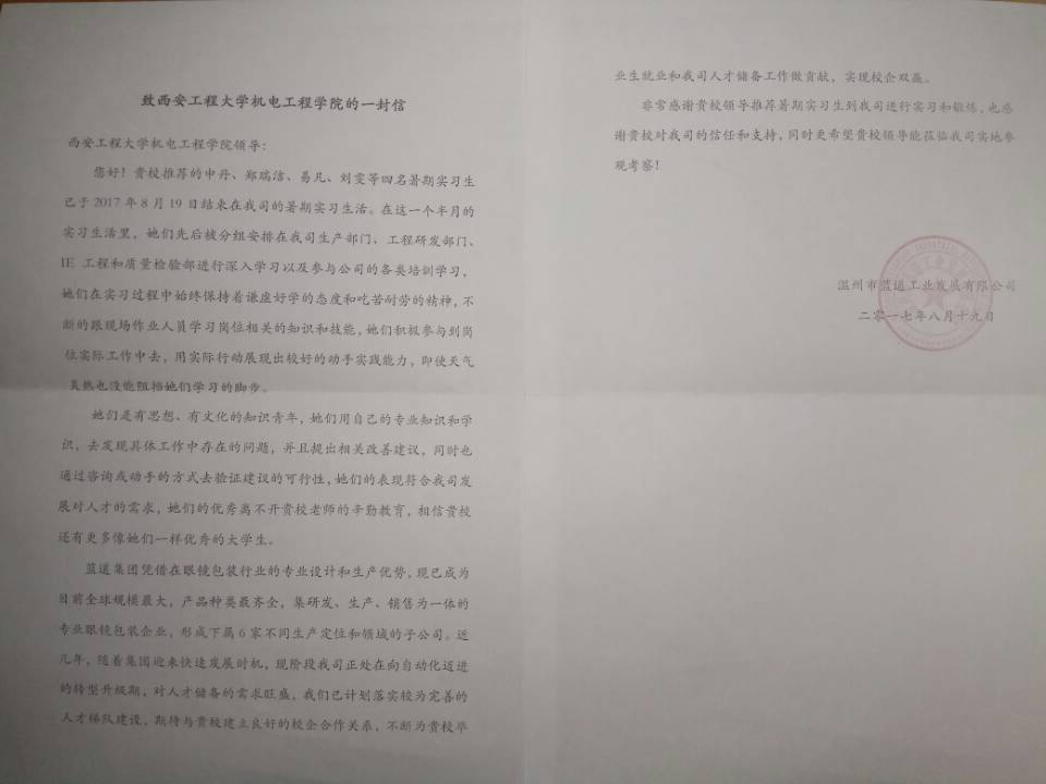 企业实习是初入职场的第一步,也是专业知识常新和发展的源泉,是检验真理的试金石,也是老员工锻炼成长的有效途径。7月上旬,机电公司党委副书记魏哲积极联系温州市蓝道工业发展有限公司为2018届毕业生提供暑期实习岗位。经员工个人申请和公司、企业筛选,企业为2014级包装工程专业员工申丹、郑瑞洁和机械设计制造及其自动化专业易凡、刘雯四名同学提供了实习机会,于7月12日至8月26日在公司实习。