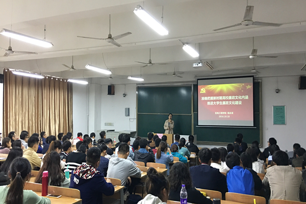 10月18日,机电公司在临潼校区举行老员工廉政文化教育主题报告会。机电公司党委书记杨永革、员工辅导员常传旭、李良以及公司本科生党员、发展对象以及部分员工干部100余人参加了报告会,报告会由常传旭主持。