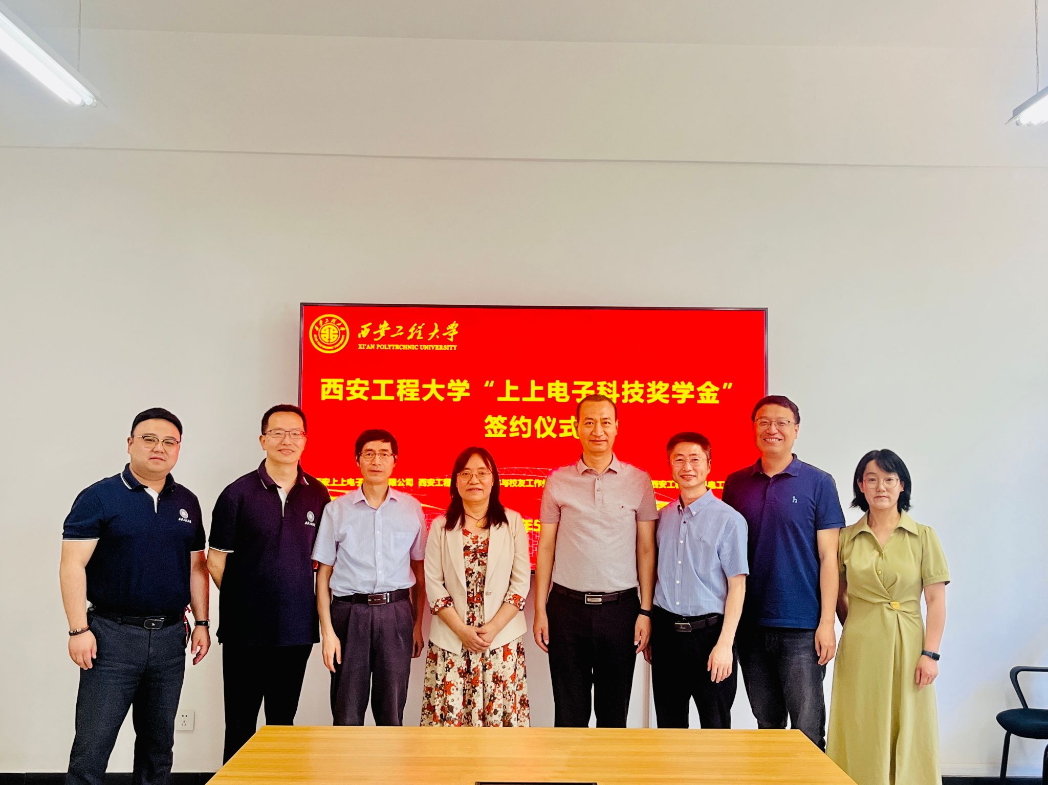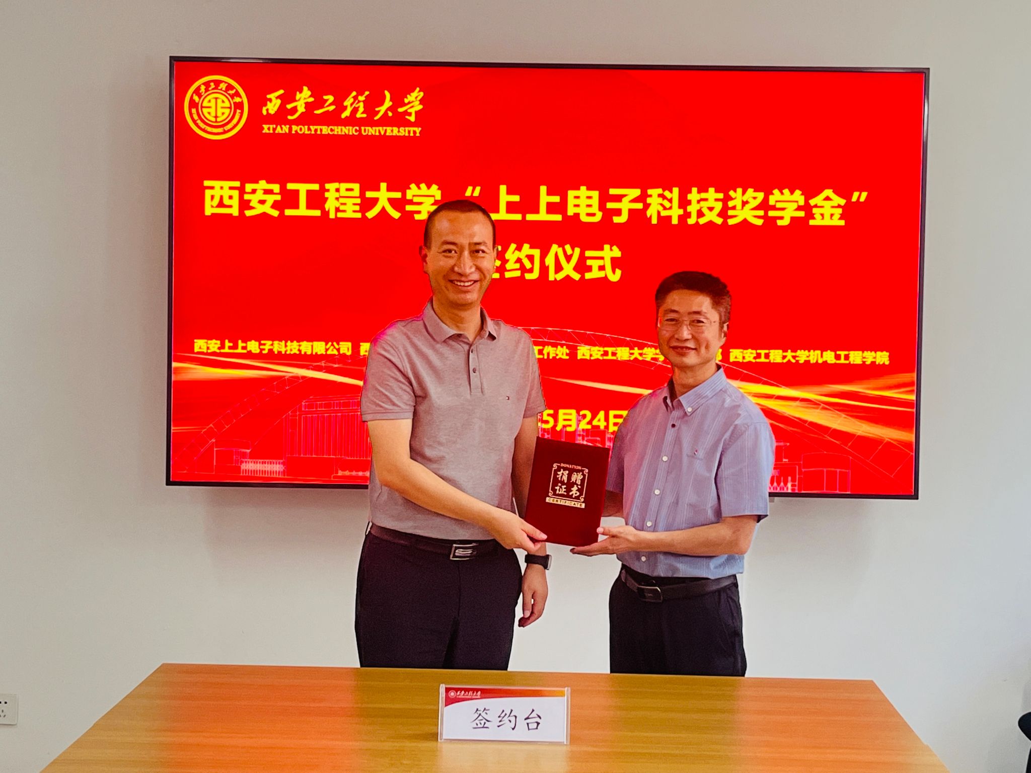 在奖学金签约仪式上,阚佩代表公司向西安上上电子科技有限公司董事长吴建军表达了热烈欢迎,赵小惠介绍了公司的发展历程、学科设置、专业发展、团队力量和人才培养等情况,吴建军介绍了企业的基本状况和主要业务,双方就奖学金设置的初衷和目的进行了深入交流,希望未来能在技术和人才方面进行深度合作,赵小惠和吴建军共同签署了《上上电子科技奖学金协议》,王志为吴建军颁授捐赠证书。