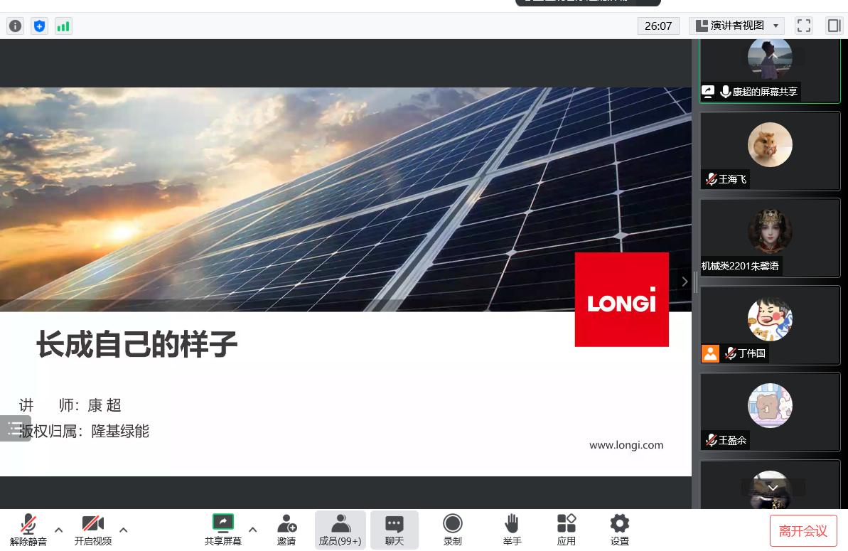 随后,隆基绿能硅片事业部经理康超以《长成自己的样子》为题,结合自己的工作经历,针对求职方面的一些问题提出了系统性的意见和建议,为同学们职业生涯规划提供了有力的帮助。