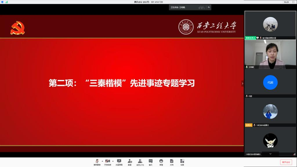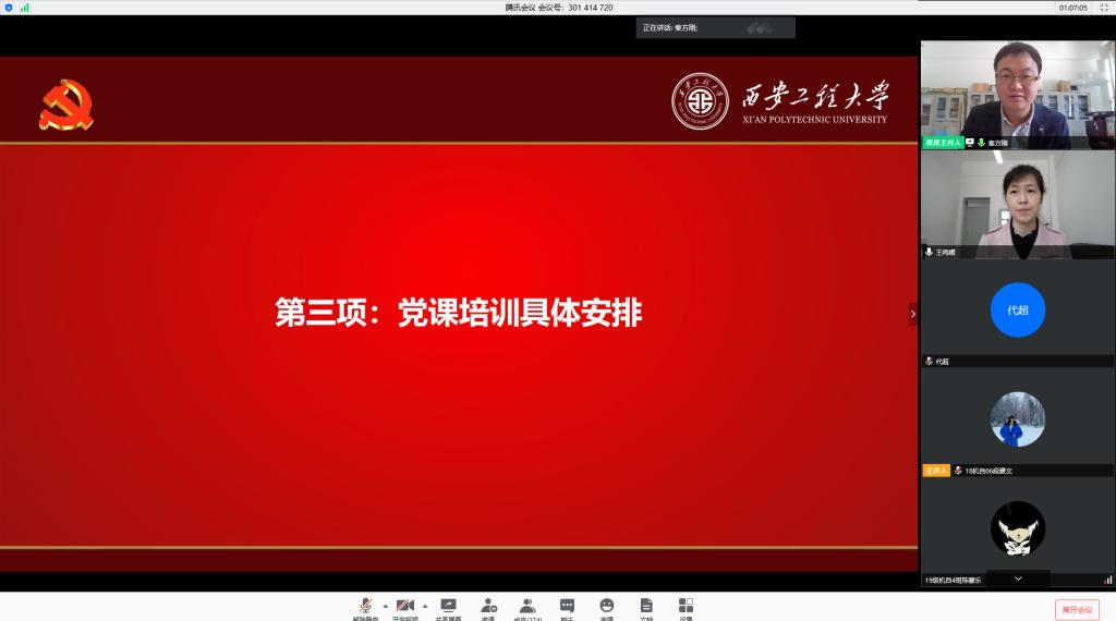 王鸣媛带领大家共同学习了“三秦楷模”施秉银、付凡平同志和赵梦桃小组的先进事迹,号召全体同学认真学习他们坚守初心使命、永远奋斗的优秀品格,学习他们舍身忘我、矢志奉献的崇高境界,学习他们恪尽职守、埋头苦干的朴实作风,学习他们勇于担当、冲锋在前的拼搏精神,在关键时刻站得出来、危急关头顶得上去的担当作为。她通报了公司教师党员在疫情防控过程中的履职尽责情况、师生党员自愿为抗击疫情捐款情况和员工志愿者积极投入到疫情防控第一线的志愿活动开展情况,要求培训班全体学员在今后的学习和生活中,更加严格要求自己,加强自身修养,发挥先锋模范作用;脚踏实地,不断锤炼个人作风,端正入党动机,争取从思想上和行动上早日入党。