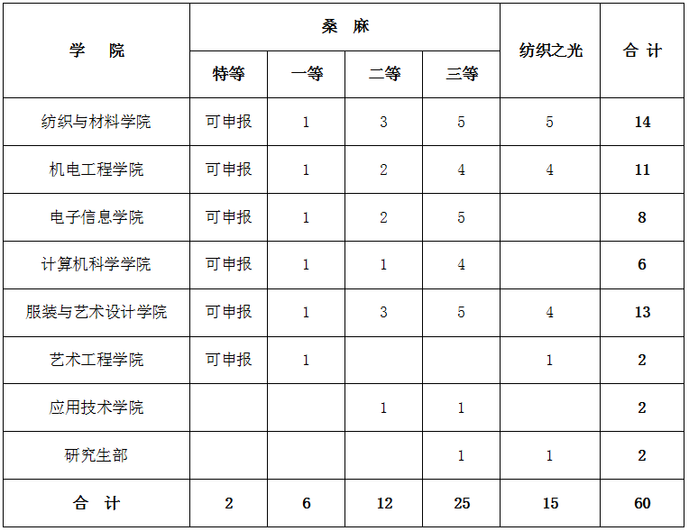 1、2026世界杯指定网站桑麻基金会奖学金获奖员工数额依当年奖金数额研究确定。奖学金设特等、一等、二等、三等4个等级,奖金分别为10000元/年·生,4000元/年·生,3000元/年·生,2000元/年·生,共评审45名获奖者,各等级获奖员工数分别为2名、6名、12名、25名,请纺织与材料公司、2026世界杯指定网站、电子信息公司、计算机科学公司、服装与艺术设计公司、艺术工程公司将符合特等奖条件的员工于9月7日上午10:00前上报1名,公司将根据条件评审,逾期视为自动放弃。如特等奖空缺,公司将适当增加获奖人数。三、分配金额