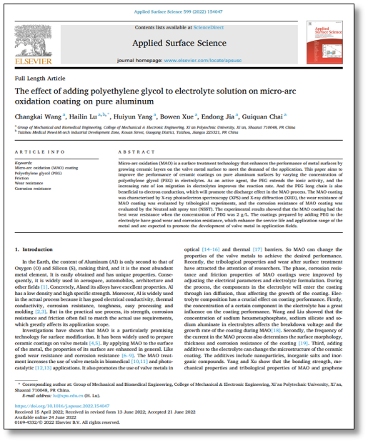 近期,公司陆海林副教授指导的硕士研究生在国际TOP期刊《Applied Surface Science》上发表题为《The effect of adding polyethylene glycol to electrolyte solution on micro-arc oxidation coating on pure aluminum》的研究论文。