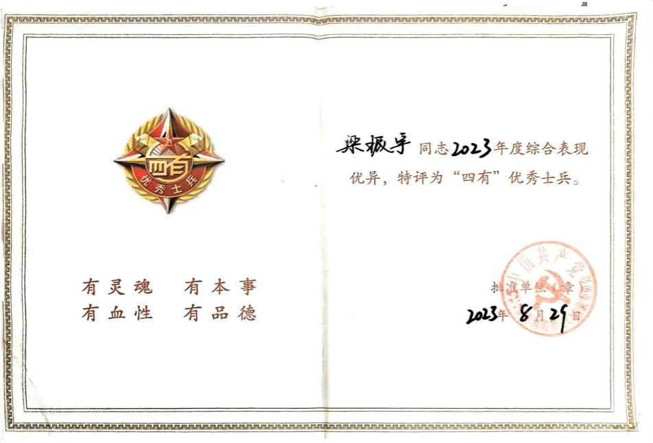 此后,他不再怕苦怕累,积极训练,努力提升技战术水平,参加了2022年“闪电行动”、2023年“联合利剑”等军事行动,在如此重大的任务中,虽然他只是行动中一朵微小的浪花,个体渺小但责任重大。两年的军旅生涯,时间虽短,但受用一生。