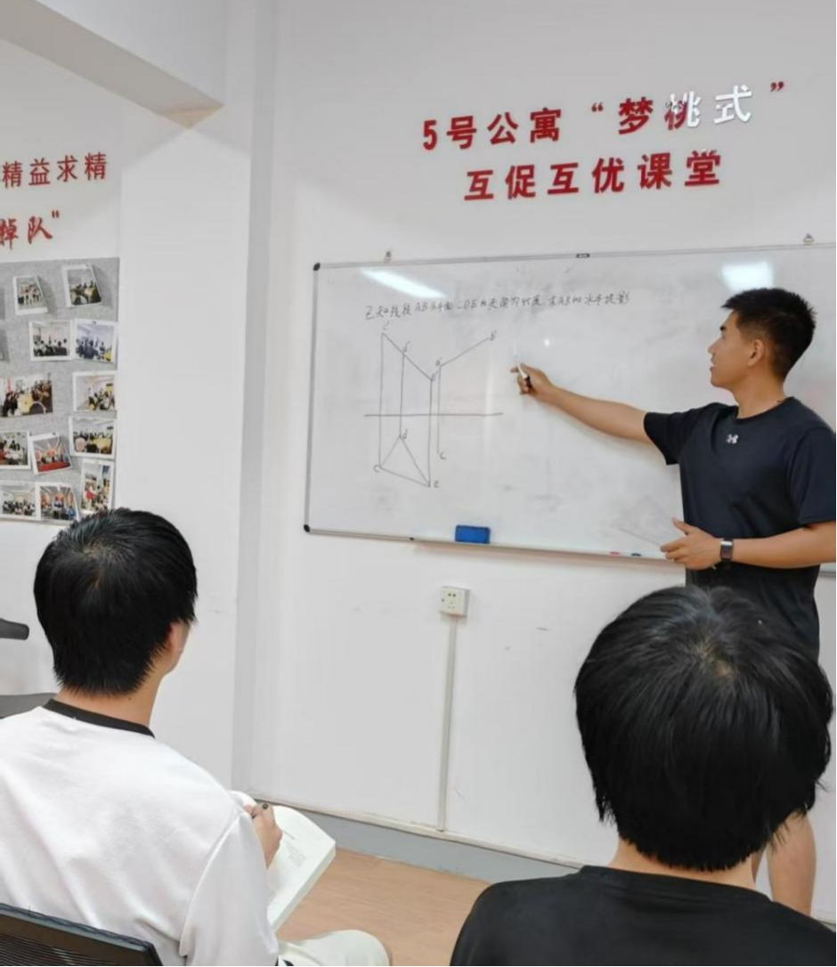 作为工科员工,大家都知道,《画法几何及机械制图》是一门兼具空间思维与细节把控难度的课,身边就有不少同学被抽象的投影原理和复杂的线条标注难倒过。梁振宇就结合制图国赛经历和三维设计软件,CAD建模,3D打印出三棱锥、齿轮泵这些教具,用实体模型让同学们直观感受线面投影关系,突破“平面图形—立体想象”的认知壁垒,把抽象的制图原理变得可触可感,成为小课堂上的学习利器。辅导之余,他还带领大家组建了校级飞盘俱乐部,跨公司成立了“飞盘趣缘搭子团”,如今俱乐部已发展超过80人,盘不落地、永不放弃的飞盘精神,让他们劳逸结合,以更好的状态投入学习。